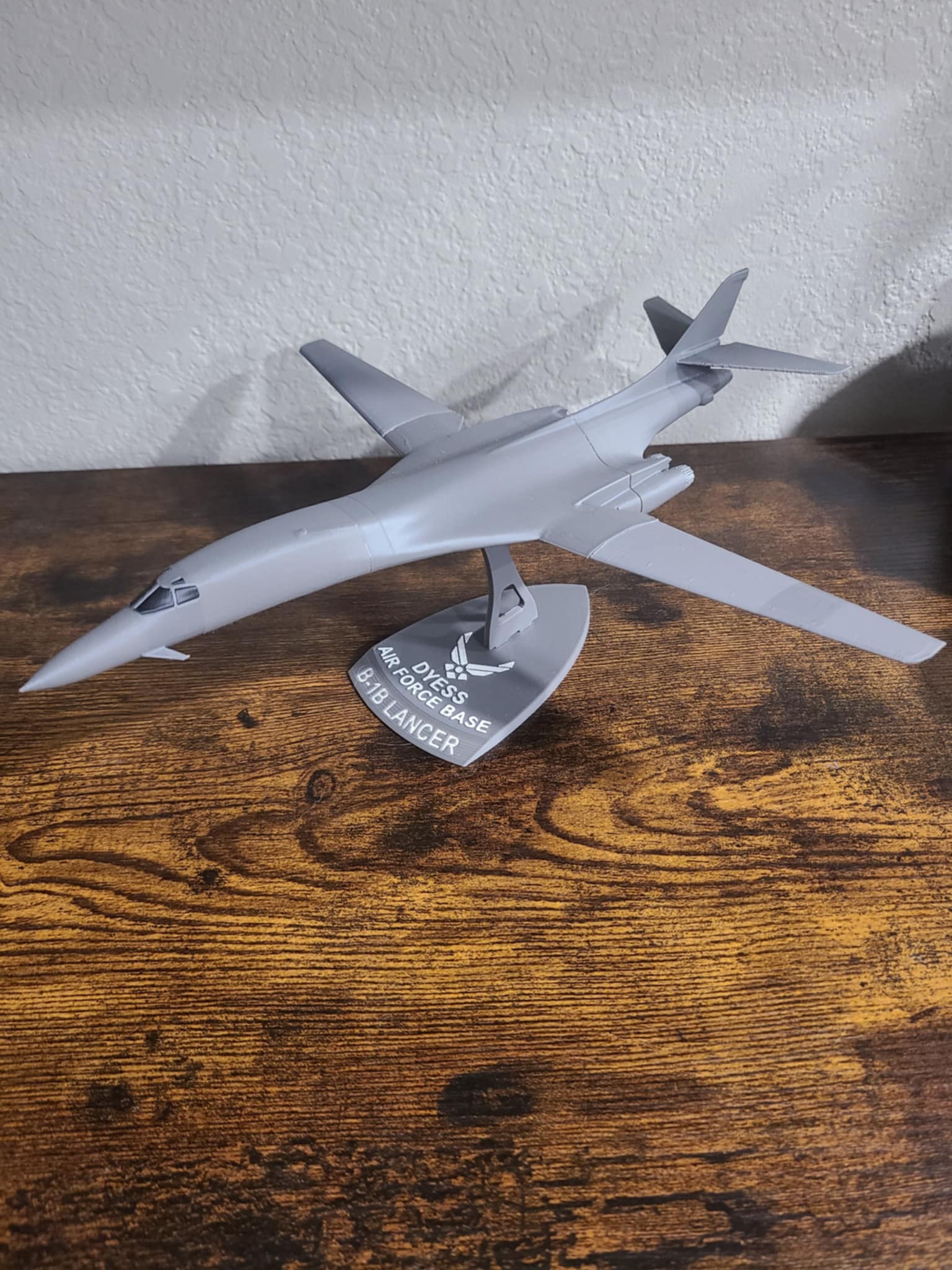 This is a model of the B-1B Lancer bomber jet. The nose to tail measurement is 14.5 inches. The wingspan is 14 inches.